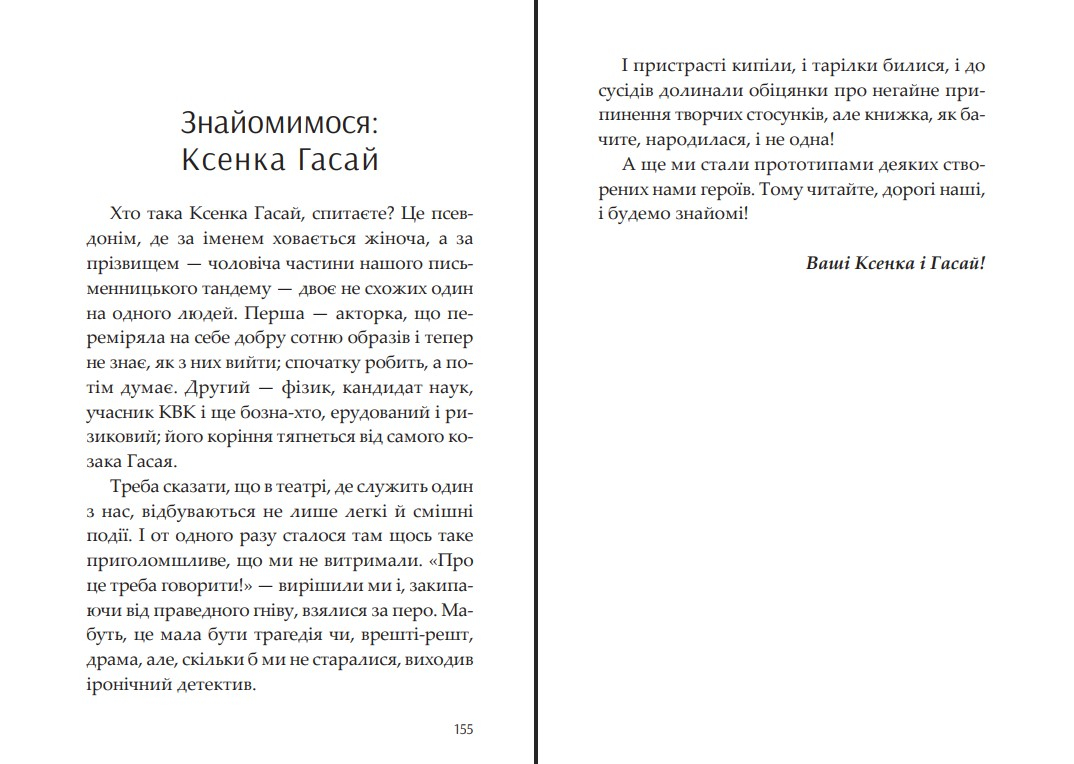 Хто така Ксенка Гасай, спитаєте? Це псевдонім, де за іменем ховається жіноча, а за прізвищем — чоловіча частини нашого письменницького тандему — двоє не схожих один на одного людей. Перша — акторка, що переміряла на себе добру сотню образів і тепер не знає, як з них вийти; спочатку робить, а потім думає. Другий — фізик, кандидат наук, учасник КВК і ще бозна-хто, ерудований і ризиковий; його коріння тягнеться від самого козака Гасая.