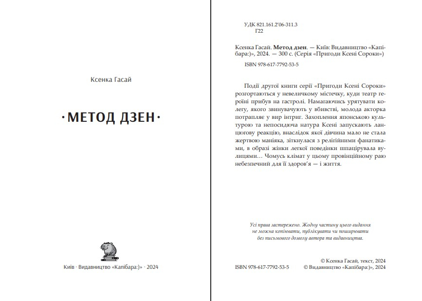 Хто така Ксенка Гасай, спитаєте? Це псевдонім, де за іменем ховається жіноча, а за прізвищем — чоловіча частини нашого письменницького тандему — двоє не схожих одне на одного людей. Перша — акторка, що переміряла на себе добру сотню образів і тепер не знає, як з них вийти; спочатку робить, а потім думає. Другий — фізик, кандидат наук, учасник КВК і ще бозна-хто, ерудований і ризиковий; його коріння тягнеться від самого козака Гасая. Треба сказати, що в театрі, де служить один з нас, відбуваються не лише легкі й смішні події. І от одного разу сталося там щось таке приголомшливе, що ми не витримали. «Про це треба говорити!» — вирішили ми і, закипаючи від праведного гніву, взялися за перо. Мабуть, це мала бути трагедія чи, врешті-решт, драма, але, скільки б ми не старалися, виходив іронічний детектив.